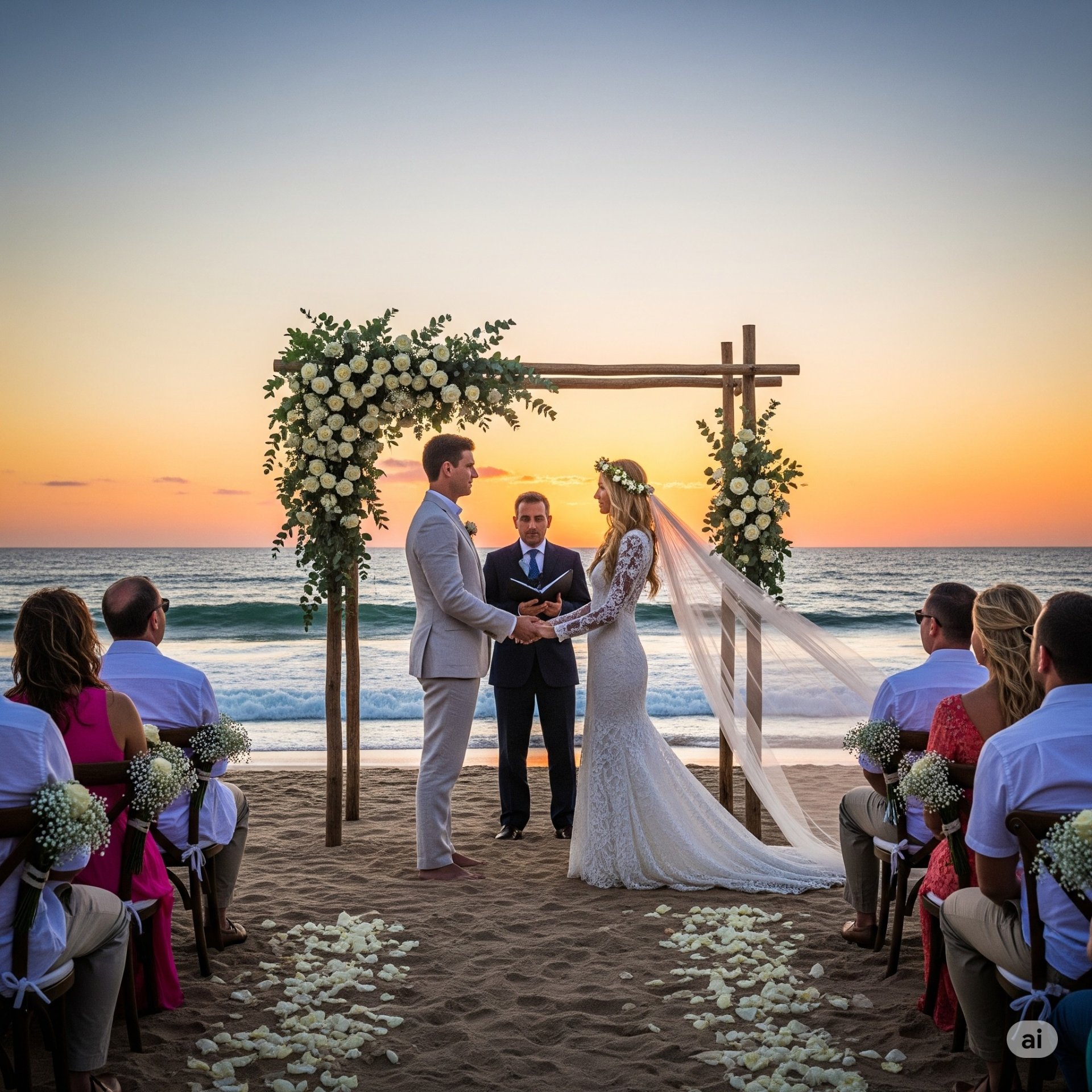 ใช้ประโยชน์จากธรรมชาติ: ชายหาดเป็นฉากหลังที่สวยงามอยู่แล้ว ใช้ประโยชน์จากองค์ประกอบตามธรรมชาติของมัน เช่น เปลือกหอย, ไม้ที่ถูกคลื่นซัด และใบปาล์มสำหรับตกแต่งโต๊ะและทางเดิน ซึ่งจะช่วยประหยัดเงินค่าจัดดอกไม้ราคาแพงได้มาก