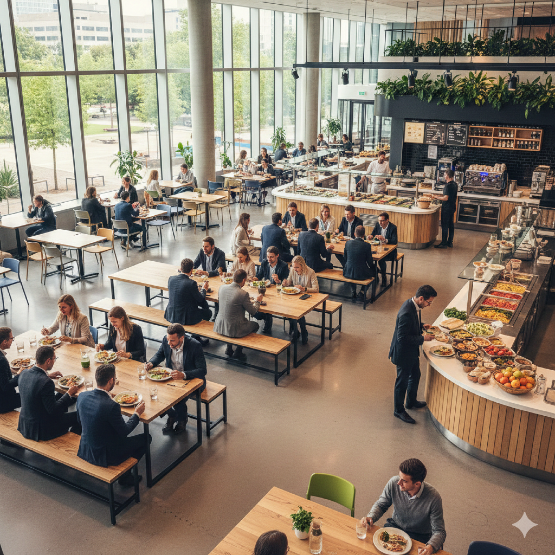 The "Power Up" Buffet: ไลน์อาหารที่ยืดหยุ่นสำหรับทีมขนาดใหญ่ มีทั้งสลัดบาร์ อาหารจานร้อน และเครื่องดื่ม