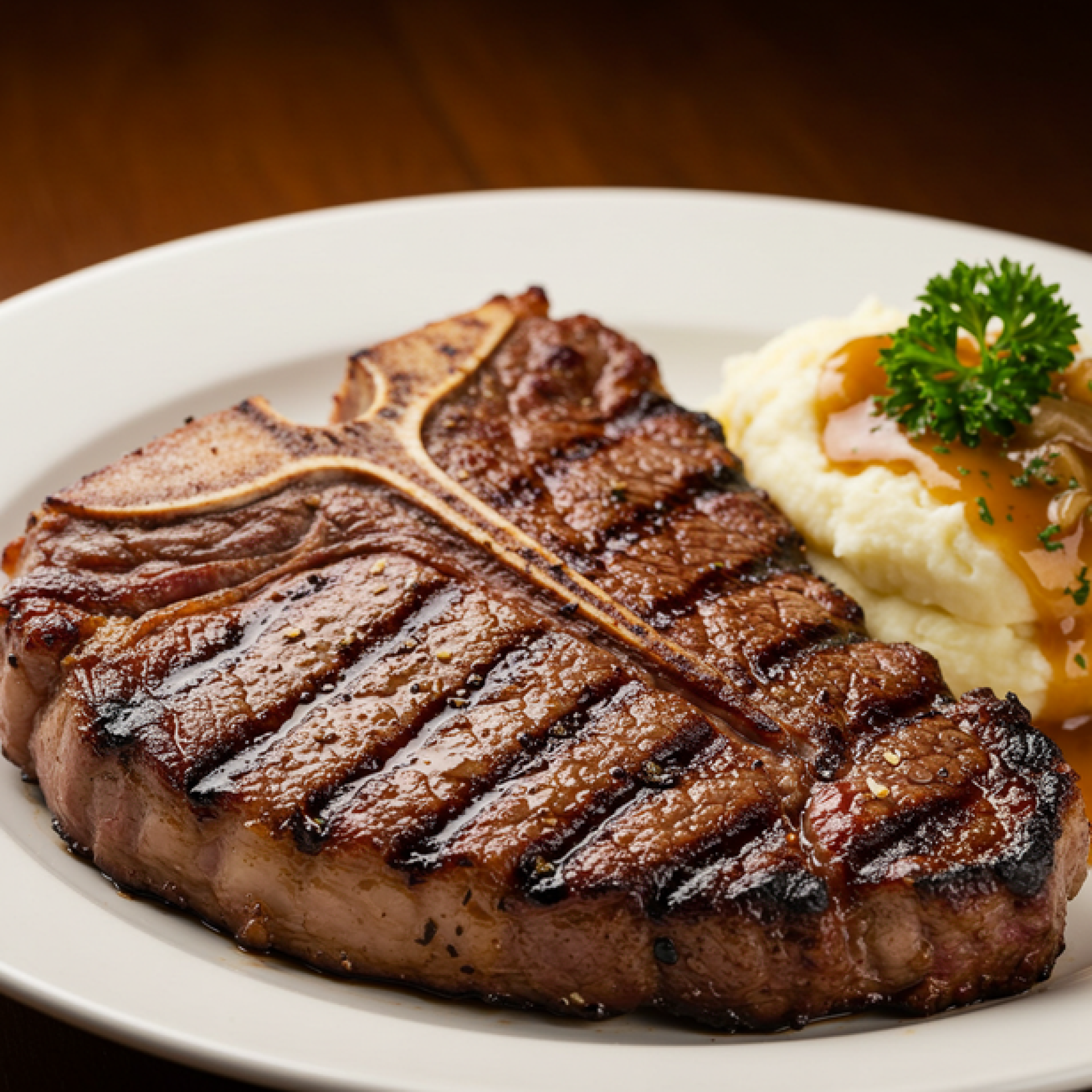 ทีโบนสเต๊กถือเป็นราชาแห่งสเต๊ก ด้วยลักษณะเด่นคือมีกระดูกเป็นรูปตัว T แบ่งเนื้อออกเป็นสองส่วน คือ สันในที่นุ่มละมุนลิ้น และสันนอกที่ฉ่ำ มีไขมันแทรกให้รสชาติเข้มข้น ทำให้ได้สัมผัสที่หลากหลายในชิ้นเดียว นิยมนำมาย่างบนกระทะหรือเตาถ่าน เพื่อให้ได้เนื้อที่สุกกำลังดี มีกลิ่นหอม และรสชาติที่ฉ่ำ เคล็ดลับในการเลือกทีโบนสเต๊กที่ดี คือ เลือกชิ้นที่มีไขมันแทรก เนื้อสีแดงสด และกดดูแล้วเนื้อจะคืนตัว ทีโบนสเต๊กมักมีขนาดใหญ่ เหมาะสำหรับรับประทานคนเดียวแบบจุใจ หรือแบ่งปันกับเพื่อนฝูง นิยมรับประทานคู่กับเฟรนช์ฟรายส์ สลัดผัก ซอสเห็ด หรือซอสพริกไทยดำ สามารถหารับประทานได้ตามร้านสเต๊กชั้นนำทั่วไป